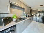 The kitchen features a range of wall and floor cabinets with sleek grey gloss doors and chrome handles. It comes fully equipped with quality integrated appliances, including a composite grey sink with a mixer tap, a four-burner gas hob with extractor, and an oven. Freestanding appliances include a washer-dryer and a double fridge-freezer. The kitchen also offers plenty of space for casual dining, making it ideal for relaxed meals with family and friends. For more formal gatherings, the separate dining room provides the perfect setting for hosting dinner parties. Completing the ground floor is a convenient w.c.