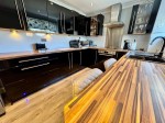The contemporary fitted dining kitchen boasts sleek black wall and base mounted units paired with butcher block effect worktops. There is ample dining space within the kitchen as well as a charming breakfasting bar; the perfect spot to enjoy your morning coffee.